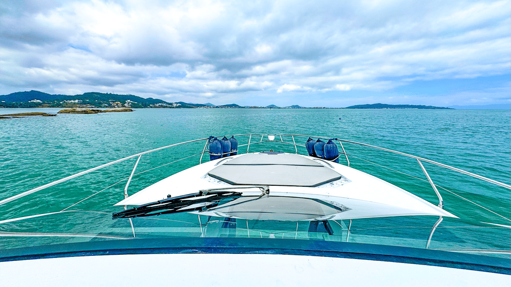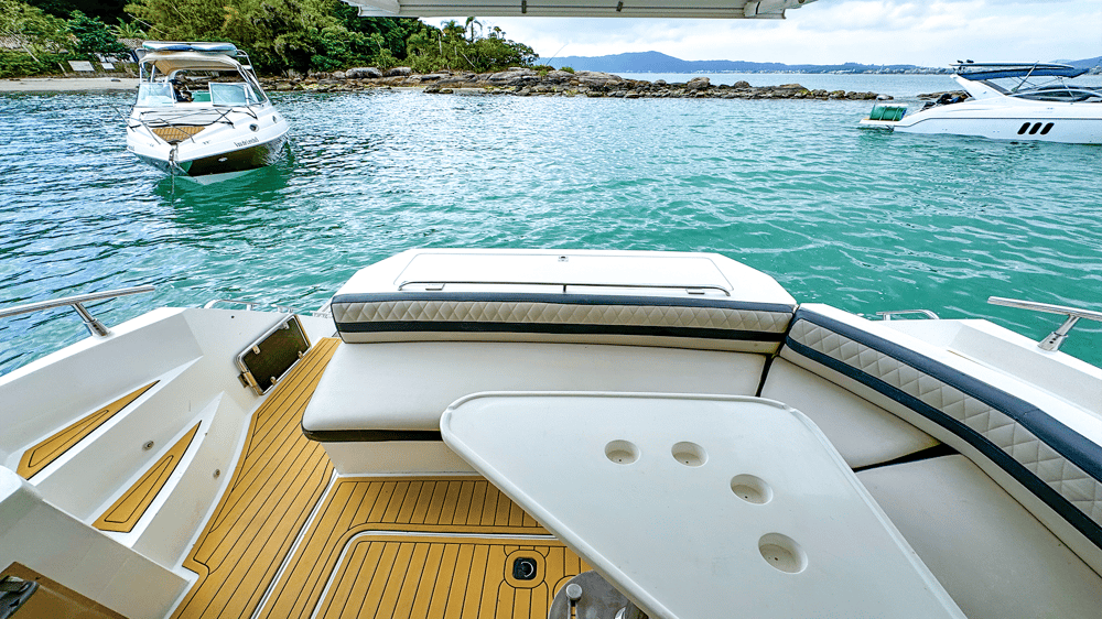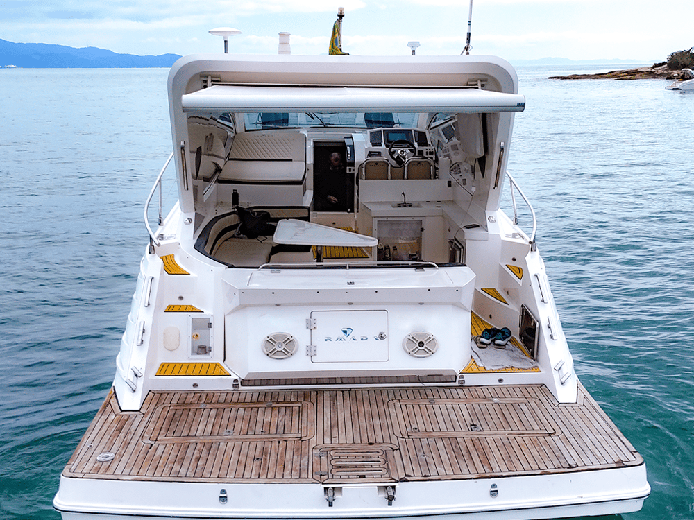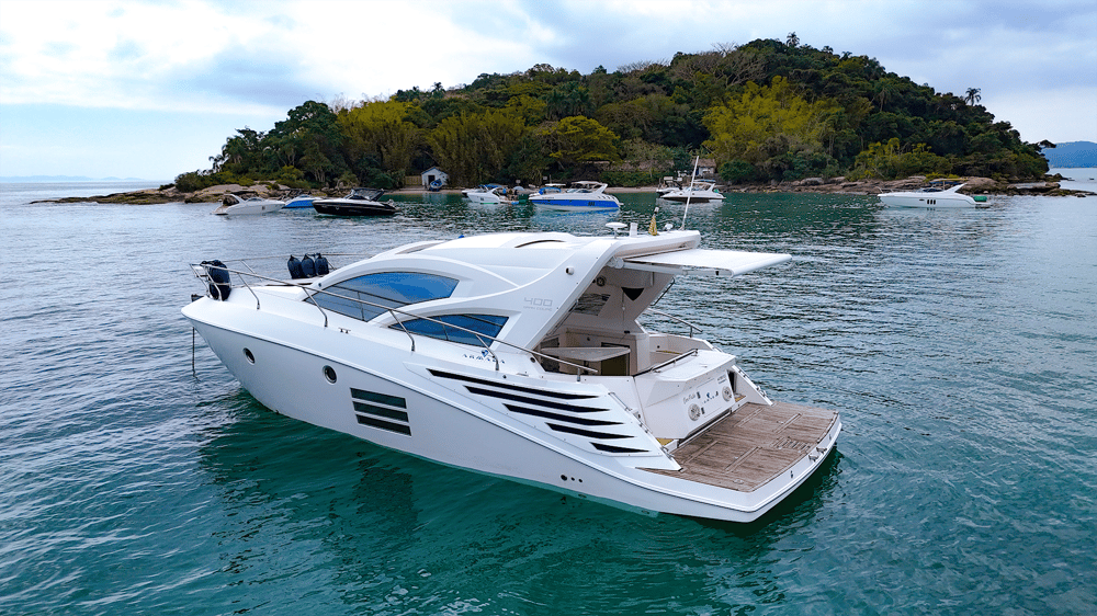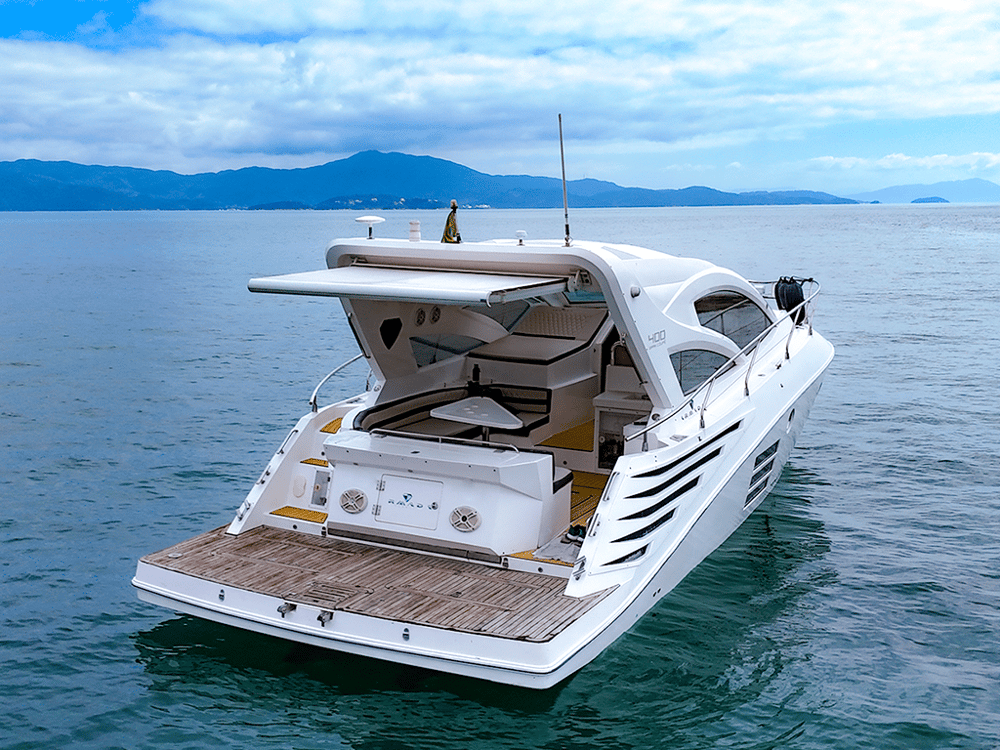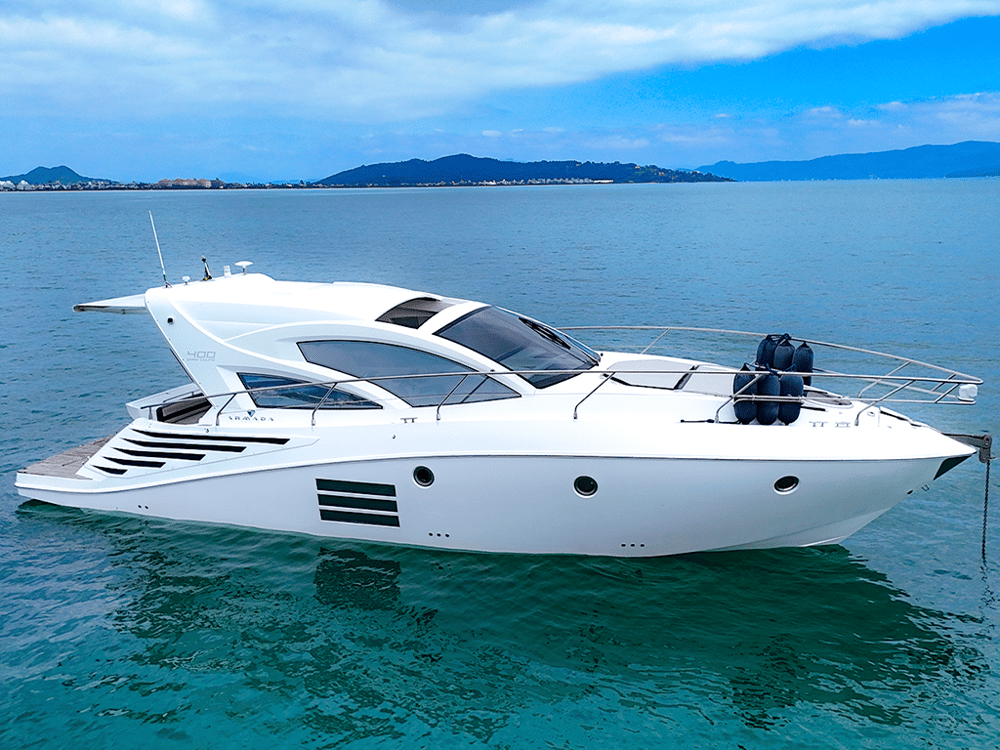 Lancha Armada 400 de 40 pés para até 13 passageiros lancha possui cozinha equipada, suíte, gerador, cabine auxiliar, ar condicionado, plataforma de popa, churrasqueira, som bluetooth,  banheiro e boias macarrão para um belo Passeio de Lancha em Florianópolis