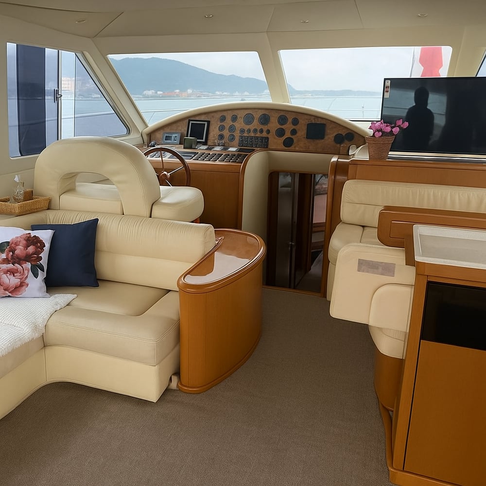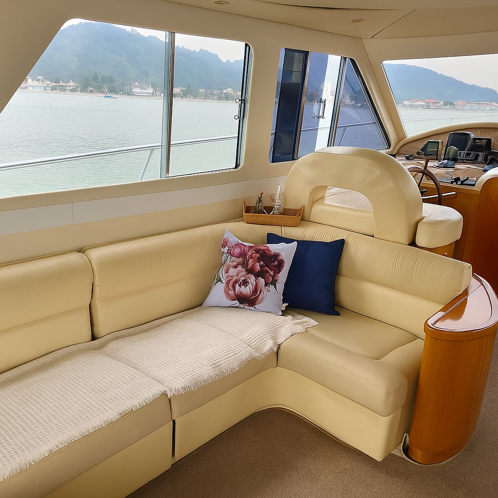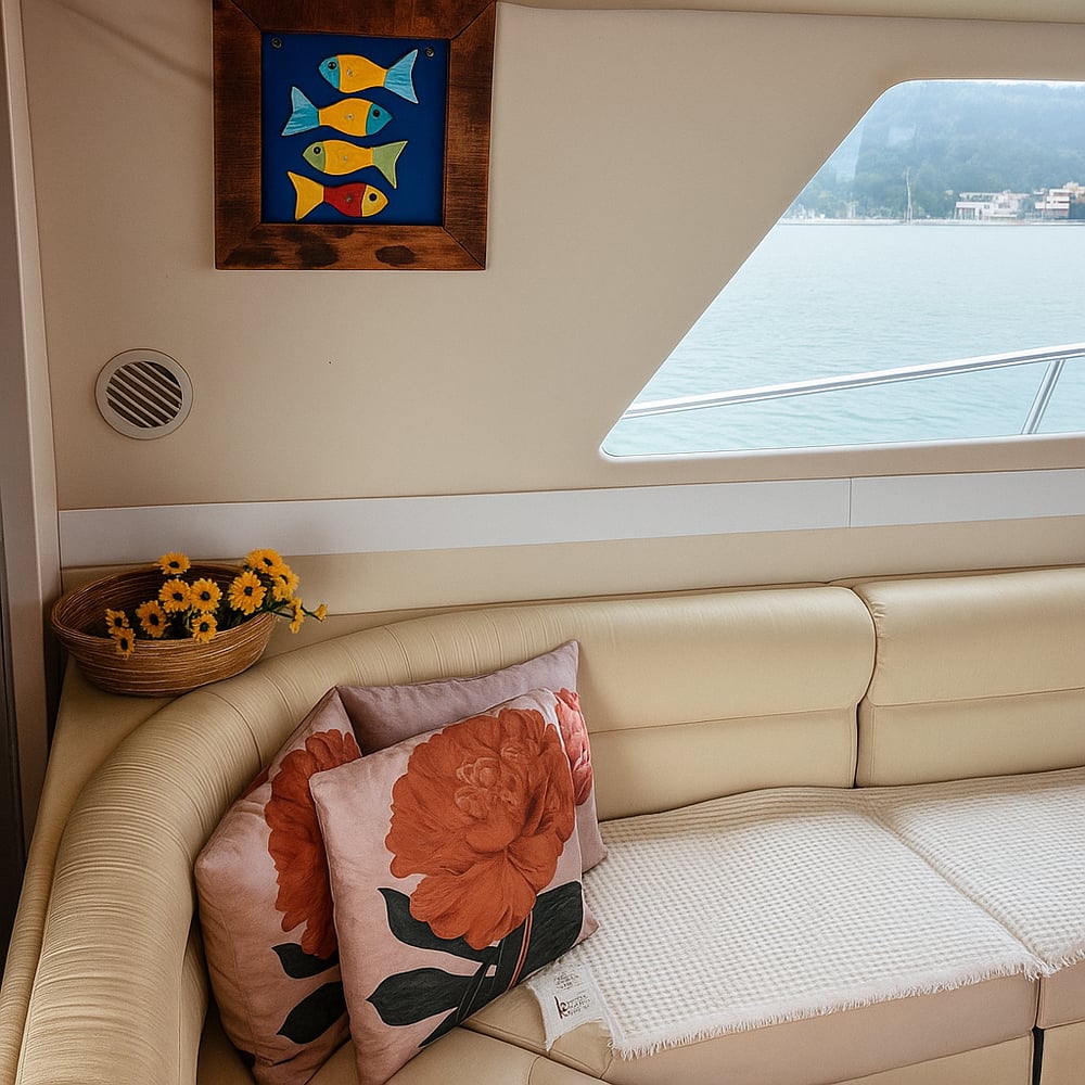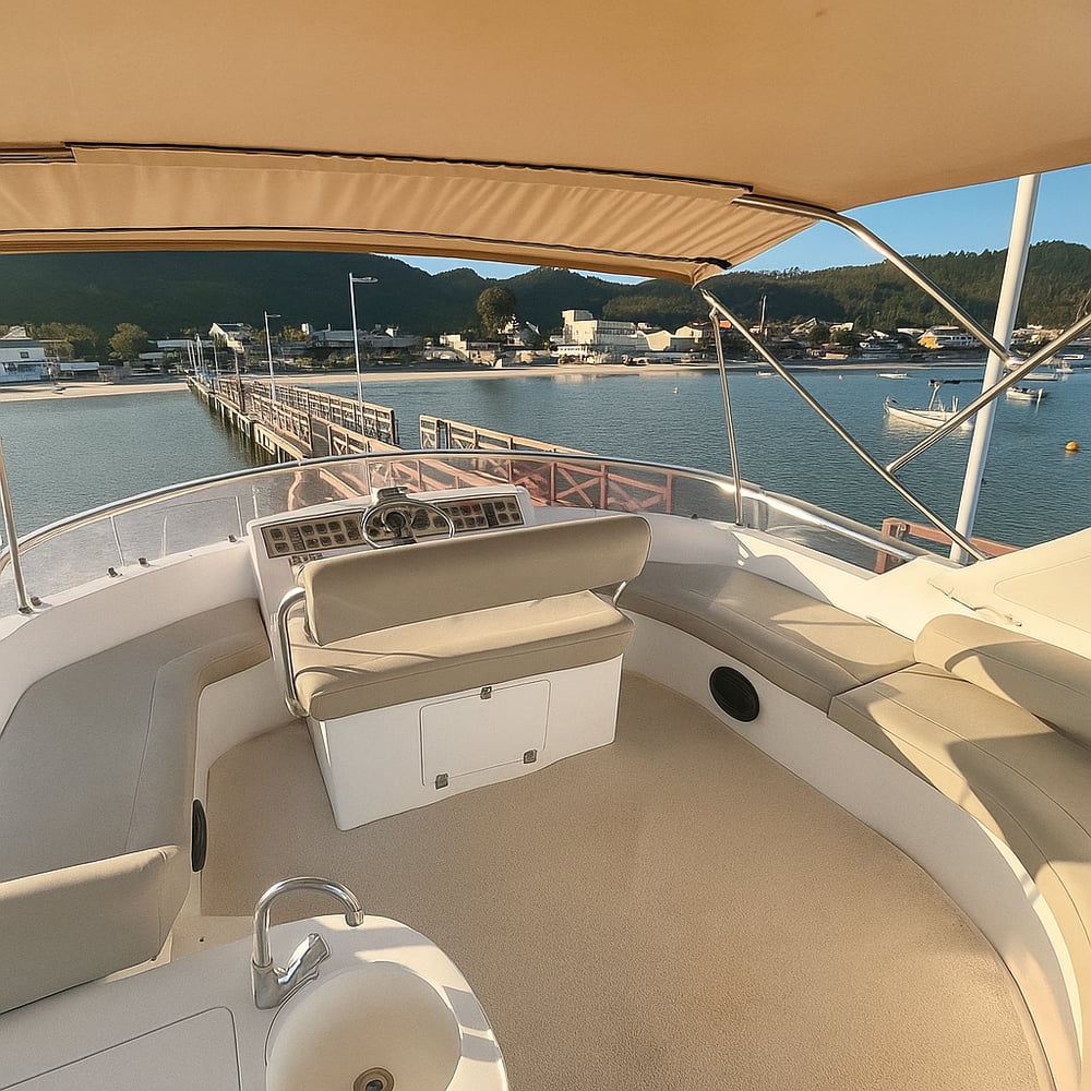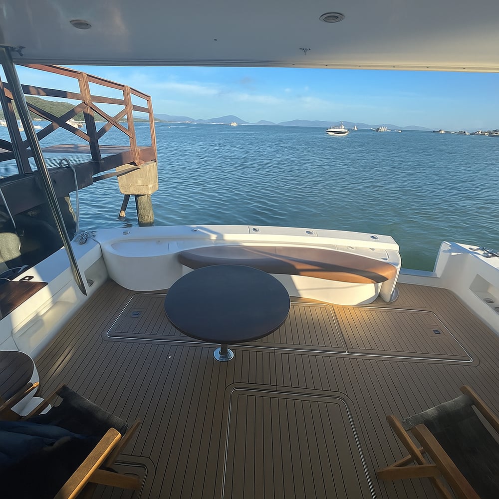 Lancha Cabrasmar 430 Fly de 43 pés para até 17 passageiros lancha possui cozinha equipada, suíte, gerador, cabine auxiliar, ar condicionado, FlyBridge, plataforma de popa, churrasqueira, som bluetooth e  banheiro. Para lazer dispõe de uma prancha de stand up paddle, um tapete flutuante e boias macarrão para um belo Passeio de Lancha em Florianópolis