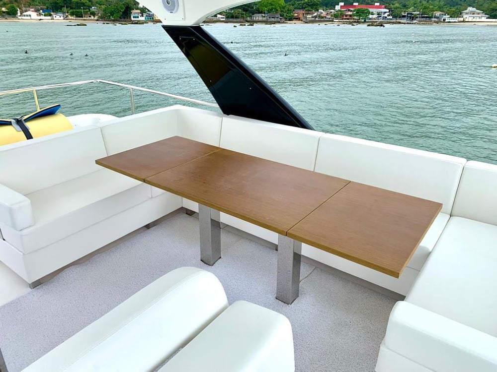 Plataforma de popa com churrasqueira e acesso a amplo salão com sofá e cadeiras, piso superior flybridge com toldo rebatível, sofás, mesa, 01 tapete flutuante, 01 prancha de stand up paddle e cooler.