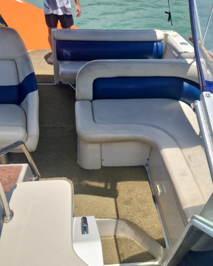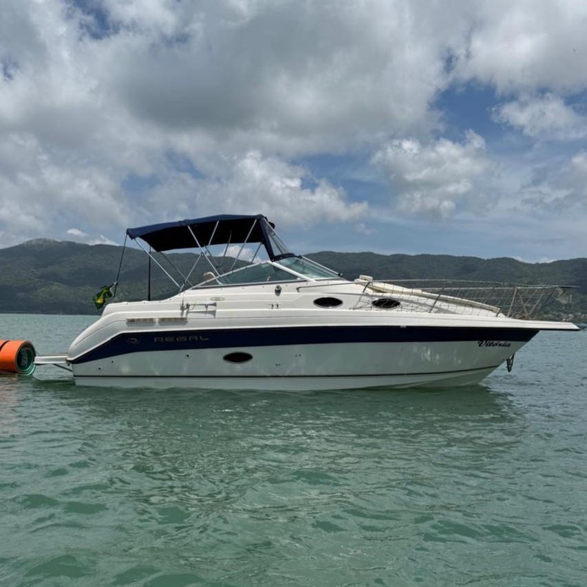 Lancha Regal 260 de 26 pés para até 07 passageiros, possui cabine fechada com banheiro, plataforma de popa, com churrasqueira, som bluetooth, proa solarium, cooler, boias macarrão.
