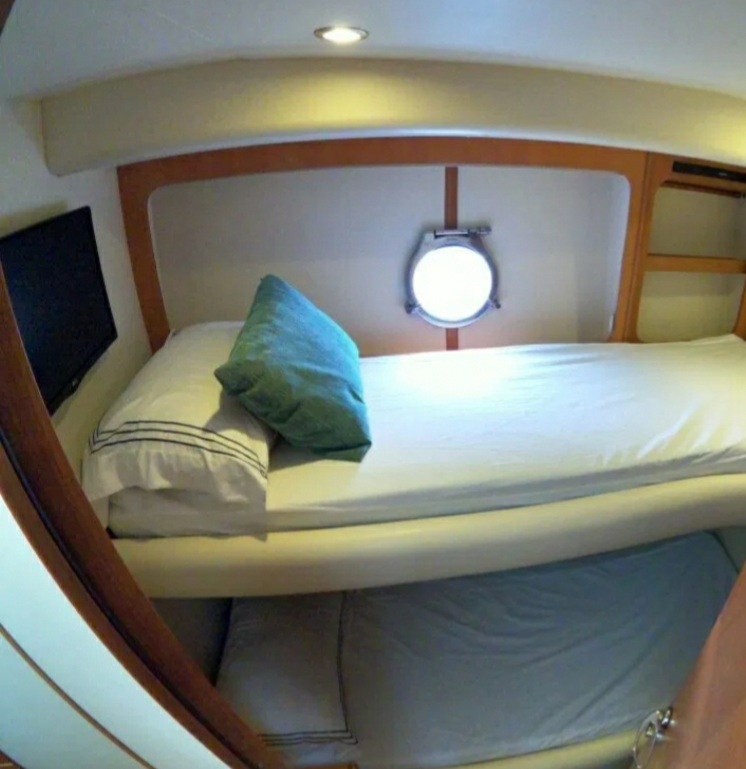 Possui dormitórios, sendo 01 suíte e 02 cabine auxiliar com 2 camas de solteiro, banheiros, cozinha equipada e uma ampla sala com tv, som bluetooth e ar condicionado.