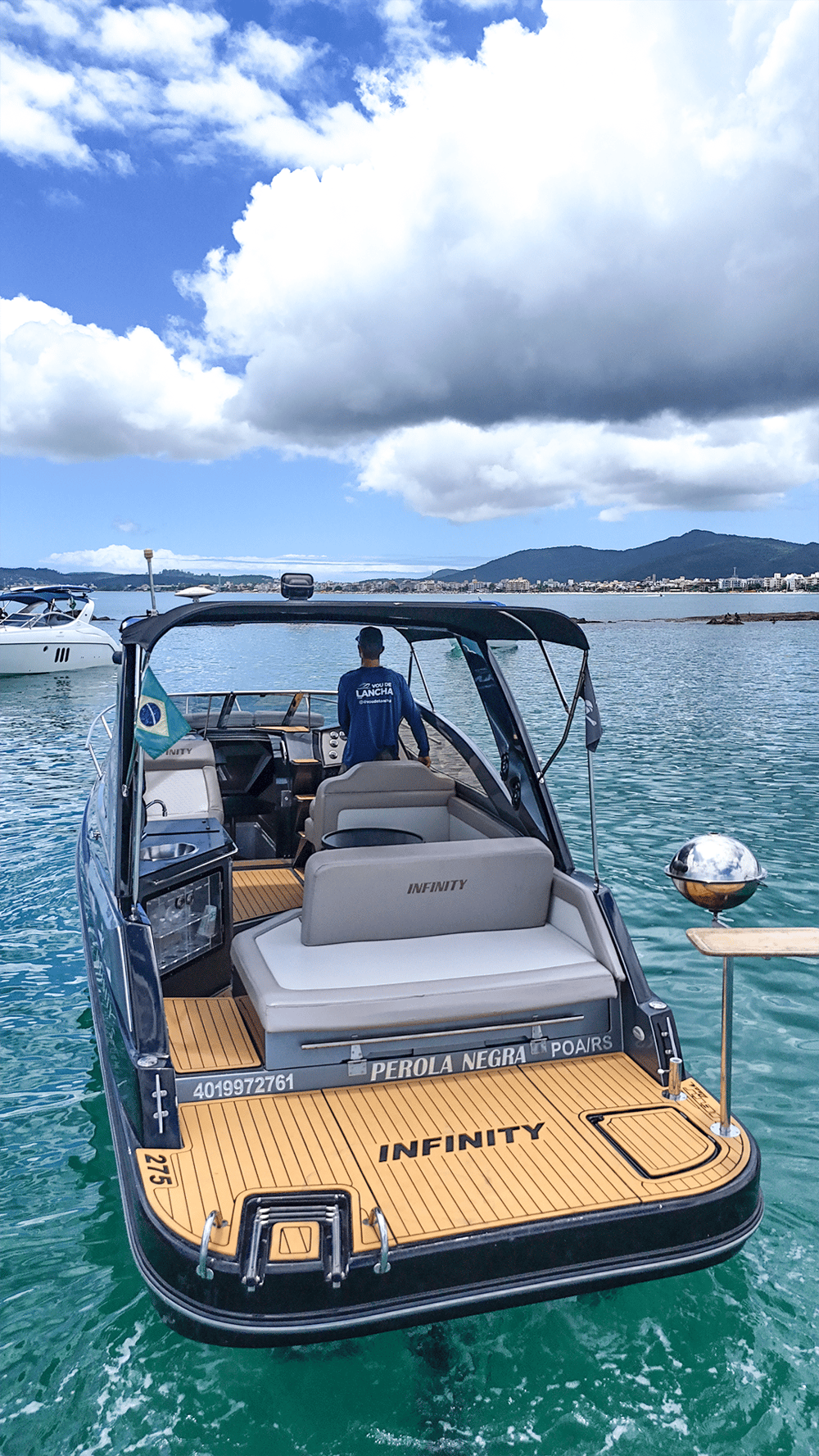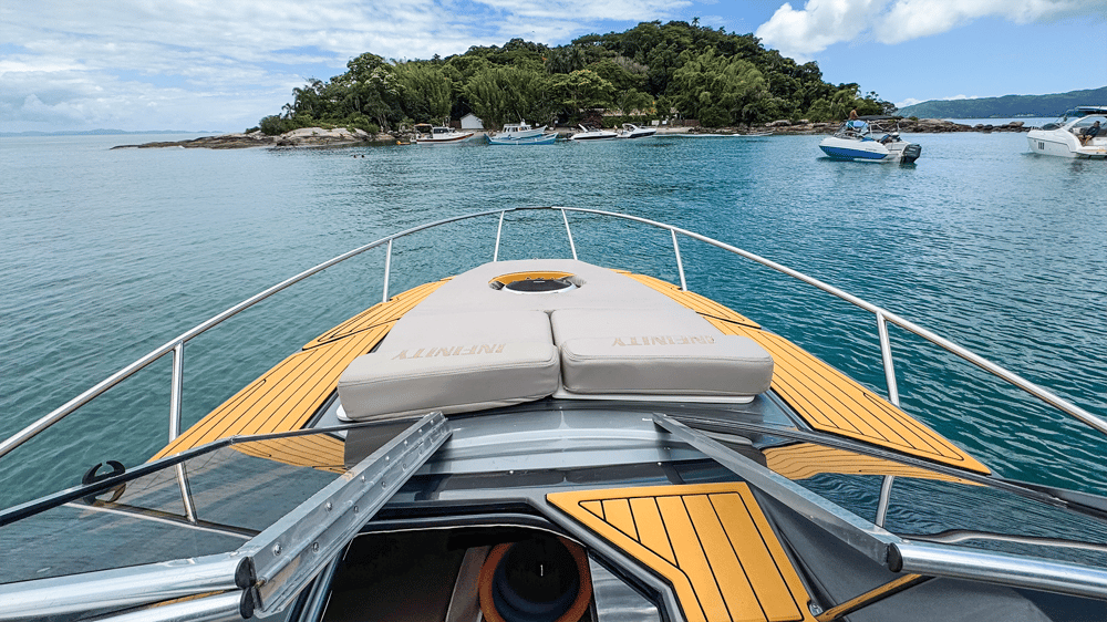 Lancha Infinity 275 de 27.5 pés para até 11 passageiros, possui cabine fechada com banheiro, plataforma de popa com churrasqueira, som bluetooh, proa solario, tapete flutuante, cooler e boias macarrão. Perfeita para um belo Passeio de Lancha em Florianópolis. Excelente opção para quem busca uma embarcação média e equipada, lancha com todos os itens de série.