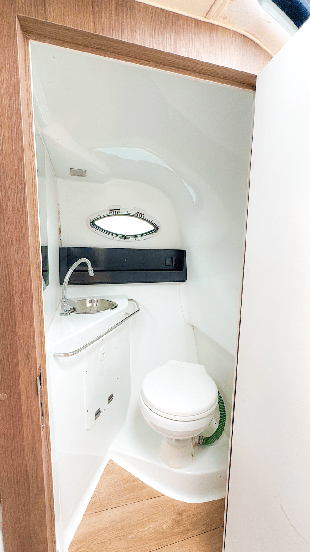 Cabine com banheiro elétrico separado.
