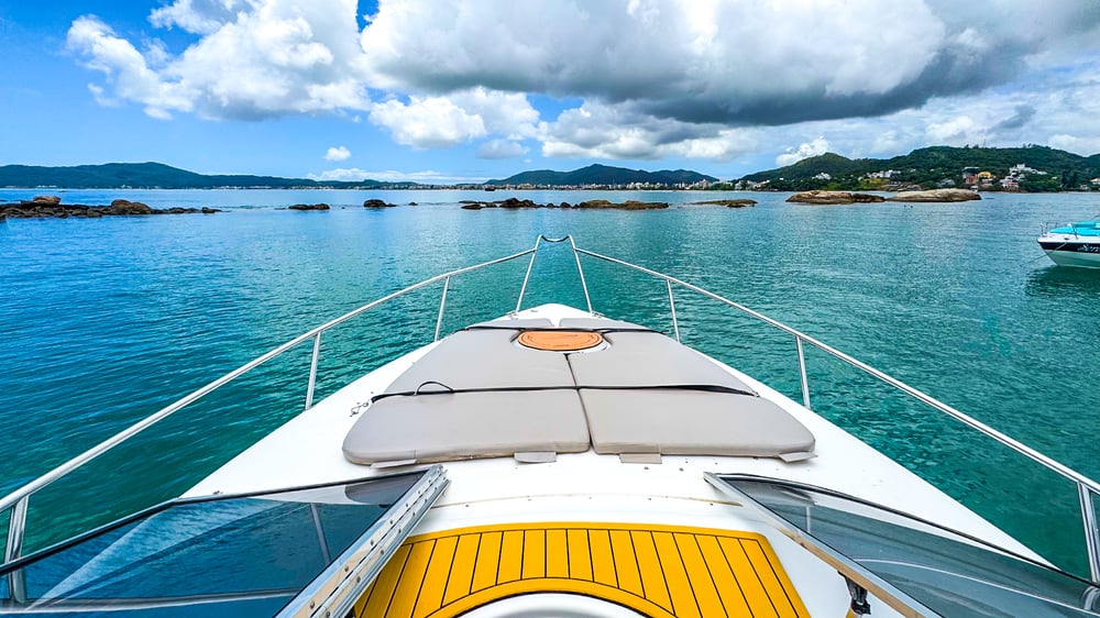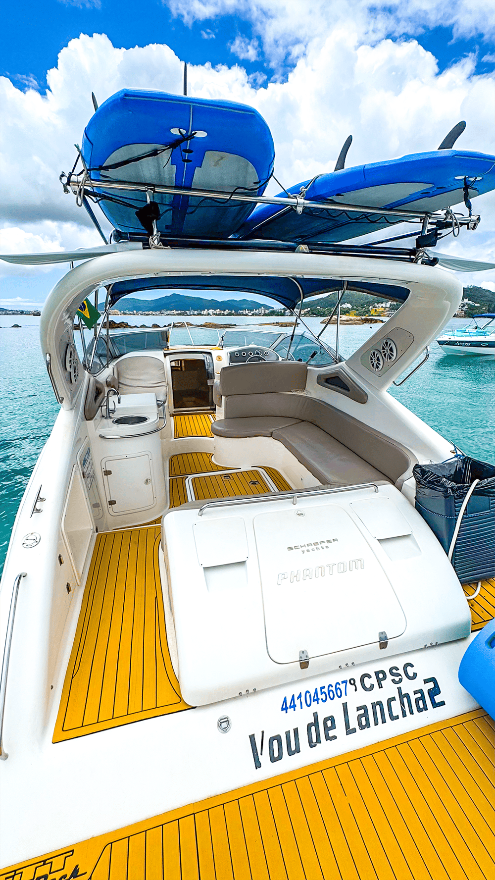 A lancha Phantom 290 tem 30 pés com plataforma estendida e é uma excelente opção custo x benefício para grupos em um belo Passeio de Lancha em Florianópolis. Excelente opção para quem busca uma embarcação média e equipada, lancha com todos os itens de série.